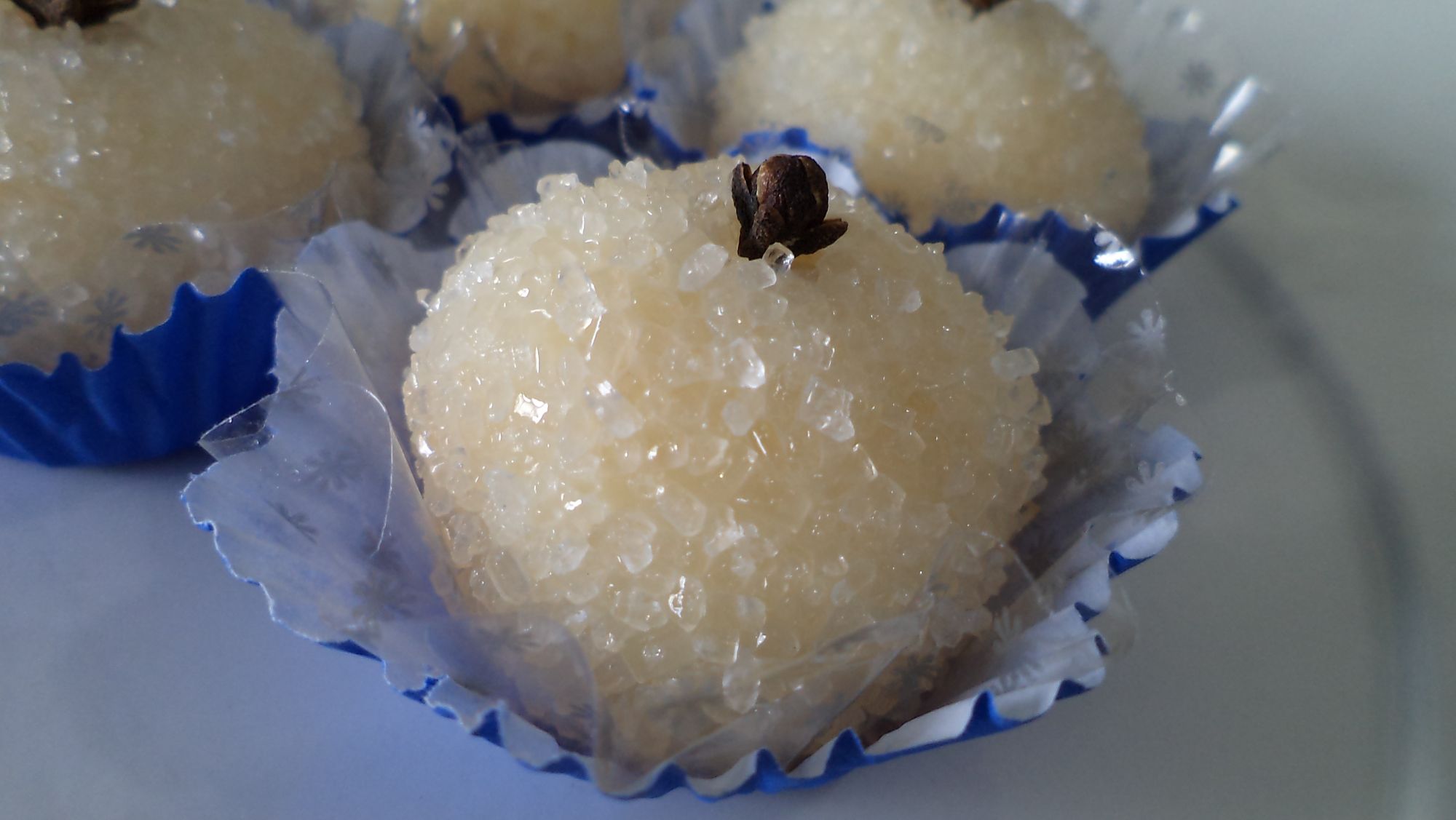 Faça bolinhas, passe pelo açúcar cristal ou coco ralado e finalize com cravos-da-índia