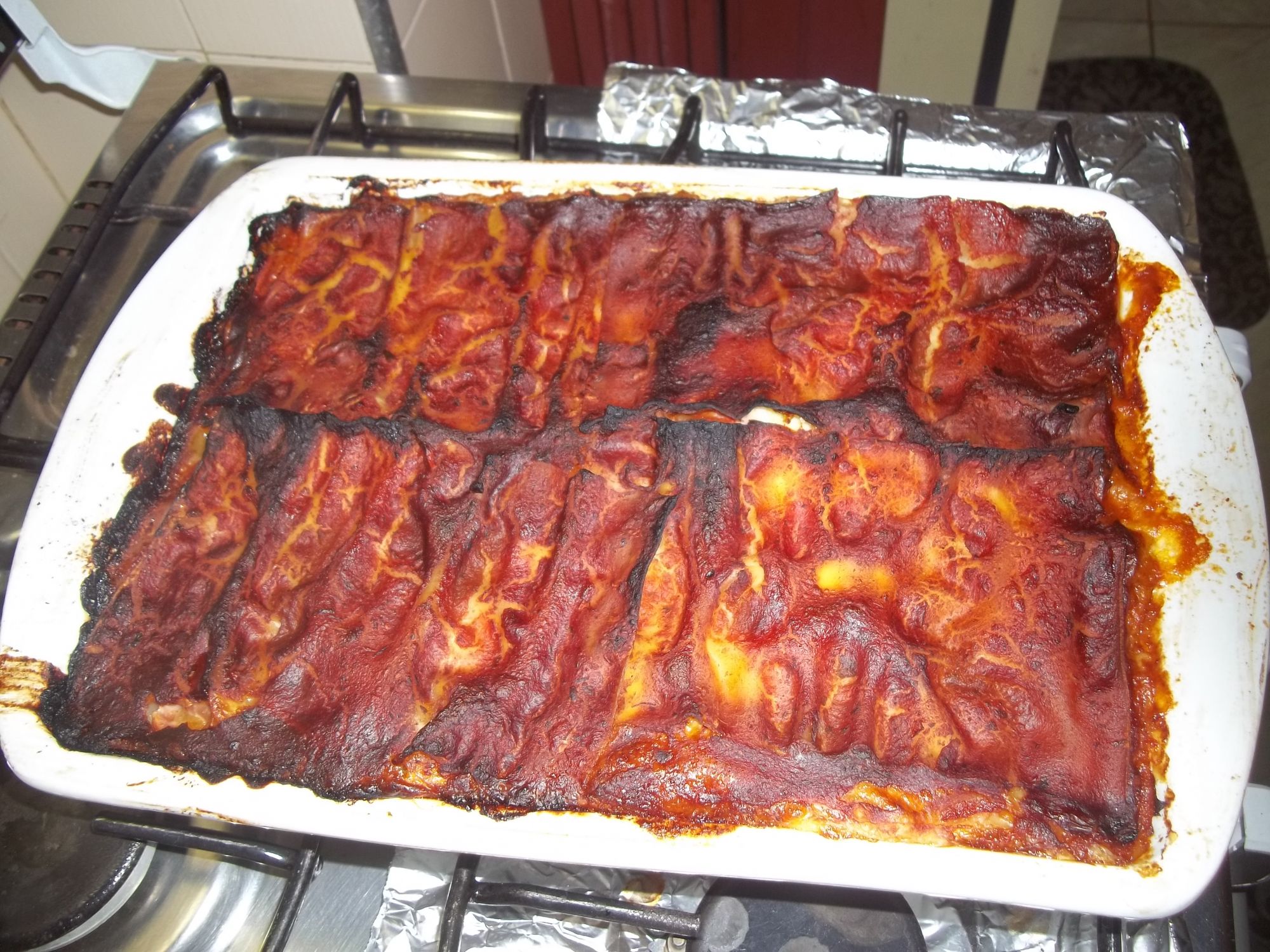 Depois uma camada de massa, outra de molho branco, uma de mussarela, outra de presunto, mais molho vermelho, depois massa.