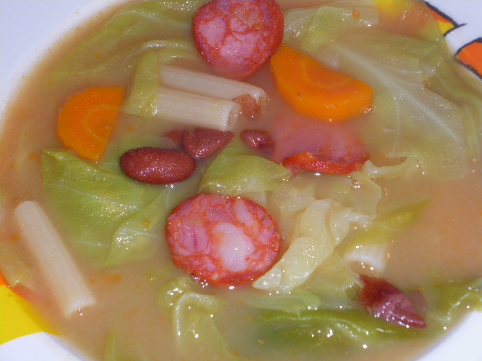 Colocar bastante água em uma panela, juntar o chouriço, a couve, nabos e cenouras, o aipo, feijão verde e ervilh...