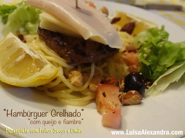 Hambúrguer Grelhado com Queijo e Fiambre Acompanhado com Esparguete com Frutos Secos e Limão